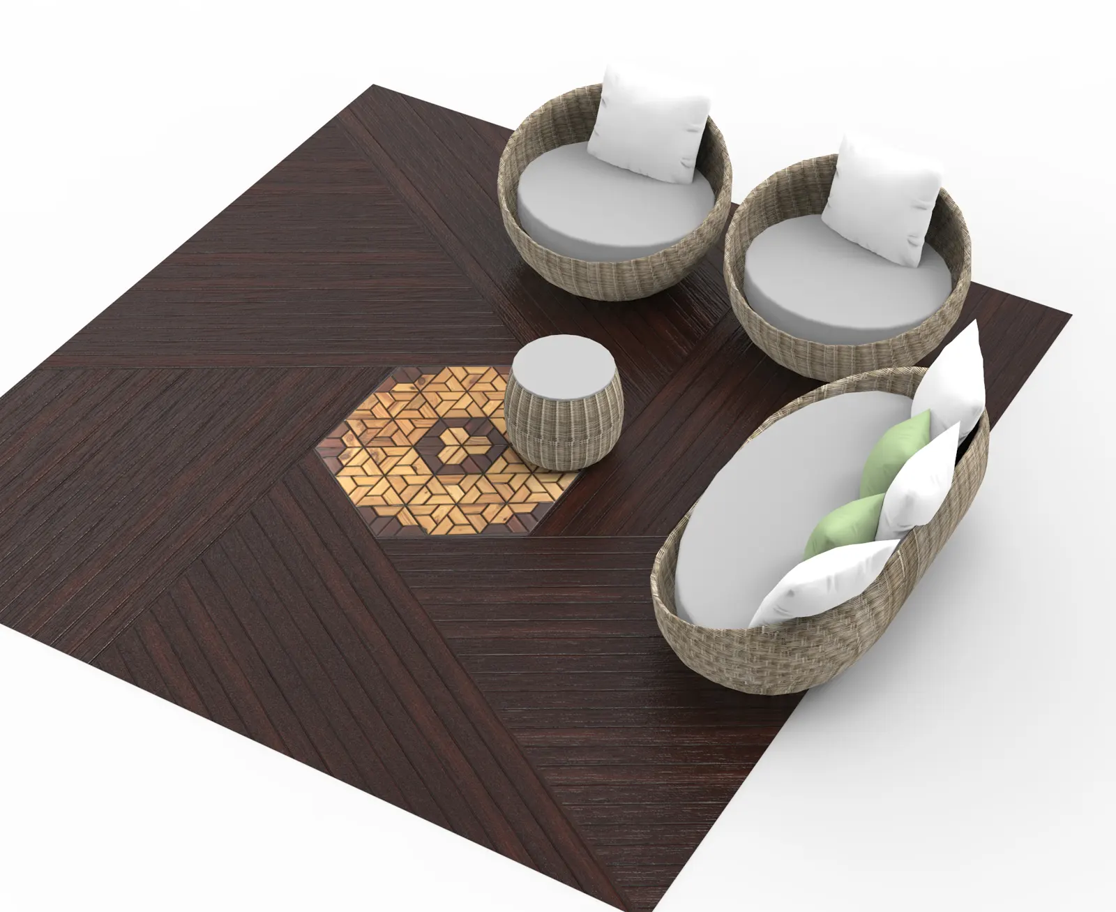 Hexidek can be incorporated into conventional decking to create a unique space. There are many ways to do this, and the example below is just one. The options are only limited by your imagination. The decking material will need to be laid on 10mm battens to bring the surface up to the same level as the Hexidek. Adequate gaps must be left for drainage.