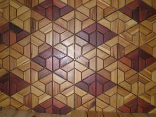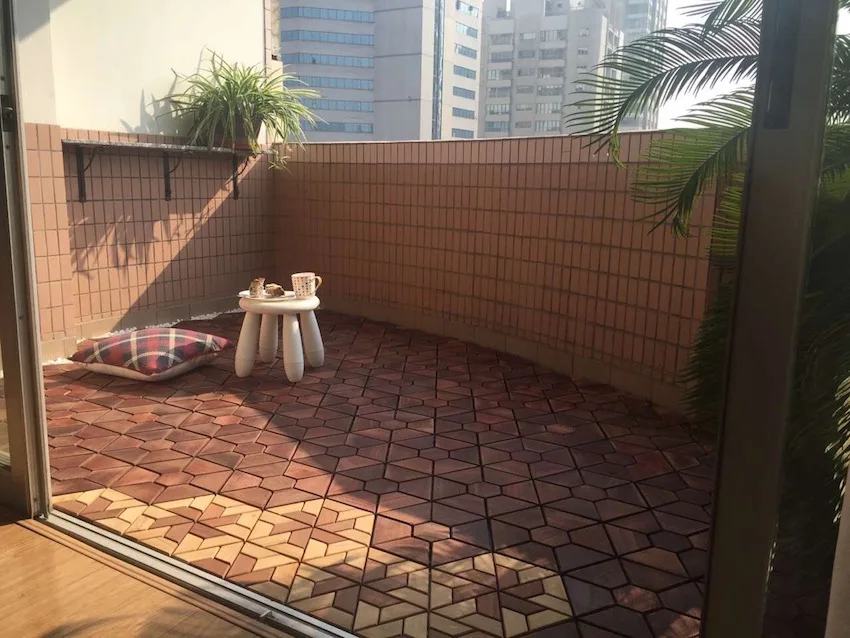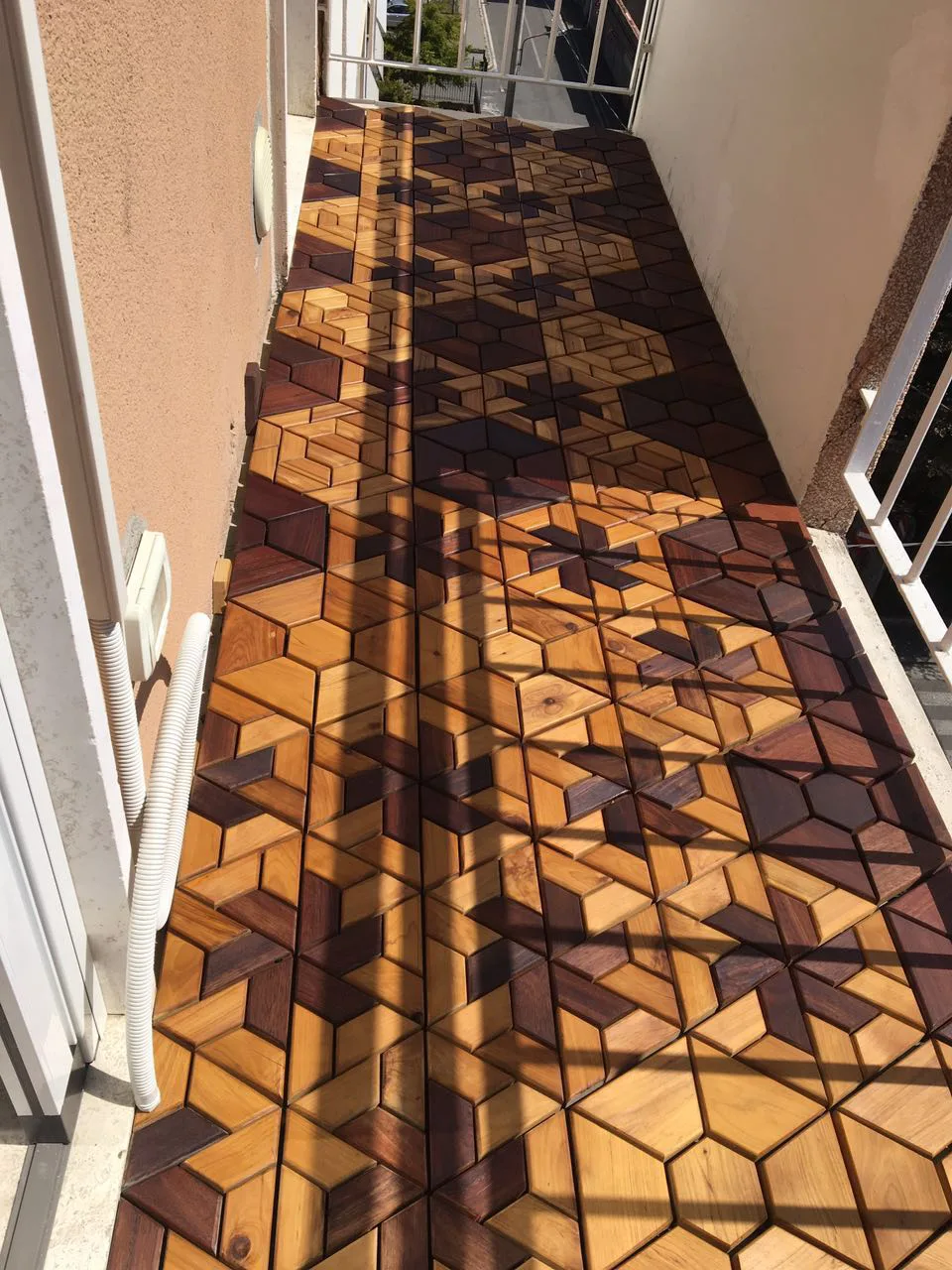 In the factory these are connected in various configurations to make panels, a few of which are shown here. The dark accents are made from Australian Jarrah. These tiles are simply clicked together on site to make patterns such as those in the following pictures. A balcony area of about 15m² can be laid in an hour of so. It is very quick and easy and requires no previous experience.
