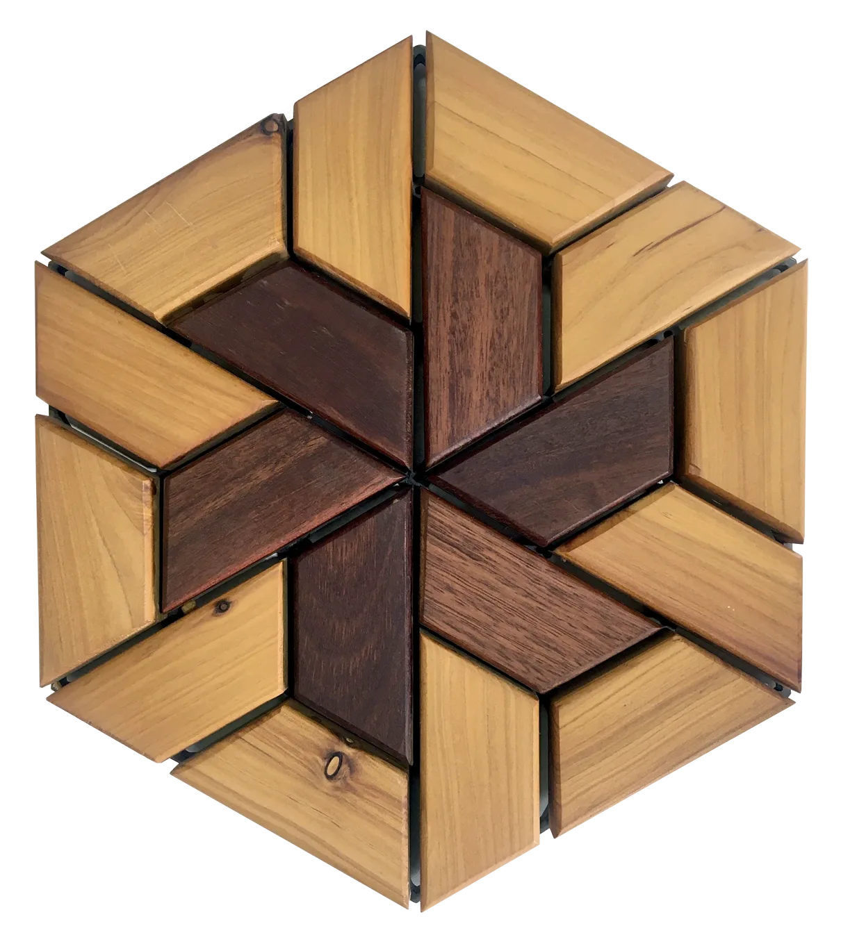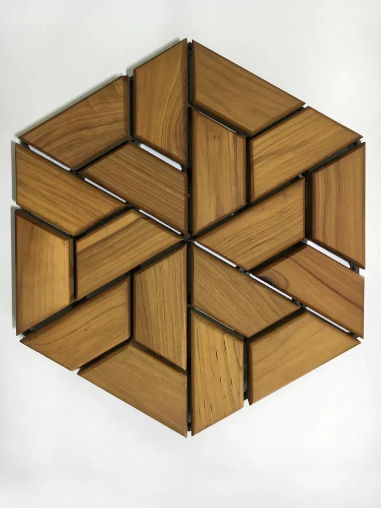 The hexagonal tile base of Hexidek is made of polypropylene plastic, which is highly durable, especially when it is protected from the sun by the cover of wooden blocks.