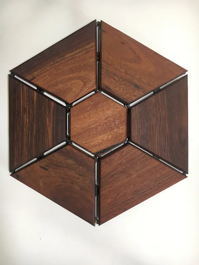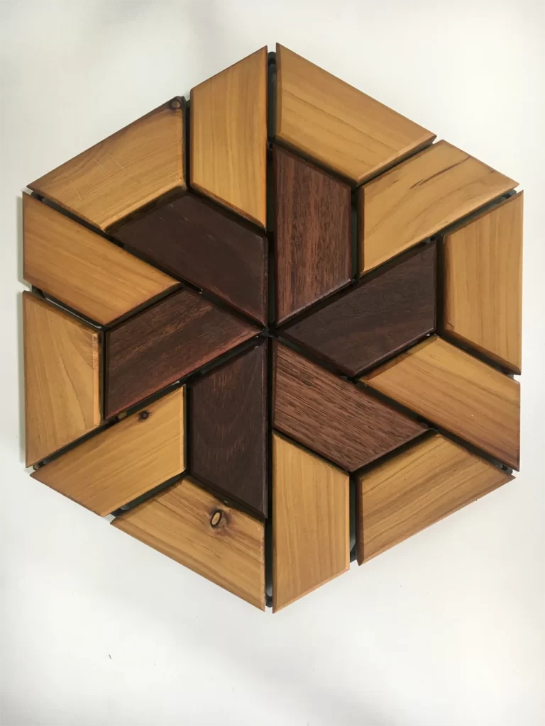 A quick Google search for “balcony garden ideas” reveals a huge and growing demand for creative small-balcony-garden solutions. If you have an old or unappealing balcony that you underuse, then Hexidek may be the solution you are looking for. Hexidek will turn your balcony into a special space where you will want sip a coffee, read a book, have a BBQ or just enjoy taking care of your plants. The product uses decking and flooring offcuts that would normally go to waste. The main species used is Australian Cypress, a highly durable, stable Australian wood that is water, mould, rot, and insect resistant. Hexidek is simple. It consists of a polypropylene base and half-hexagon or hexagon lozenges of wood that attach to the base without hardware.Solid wood lozenge